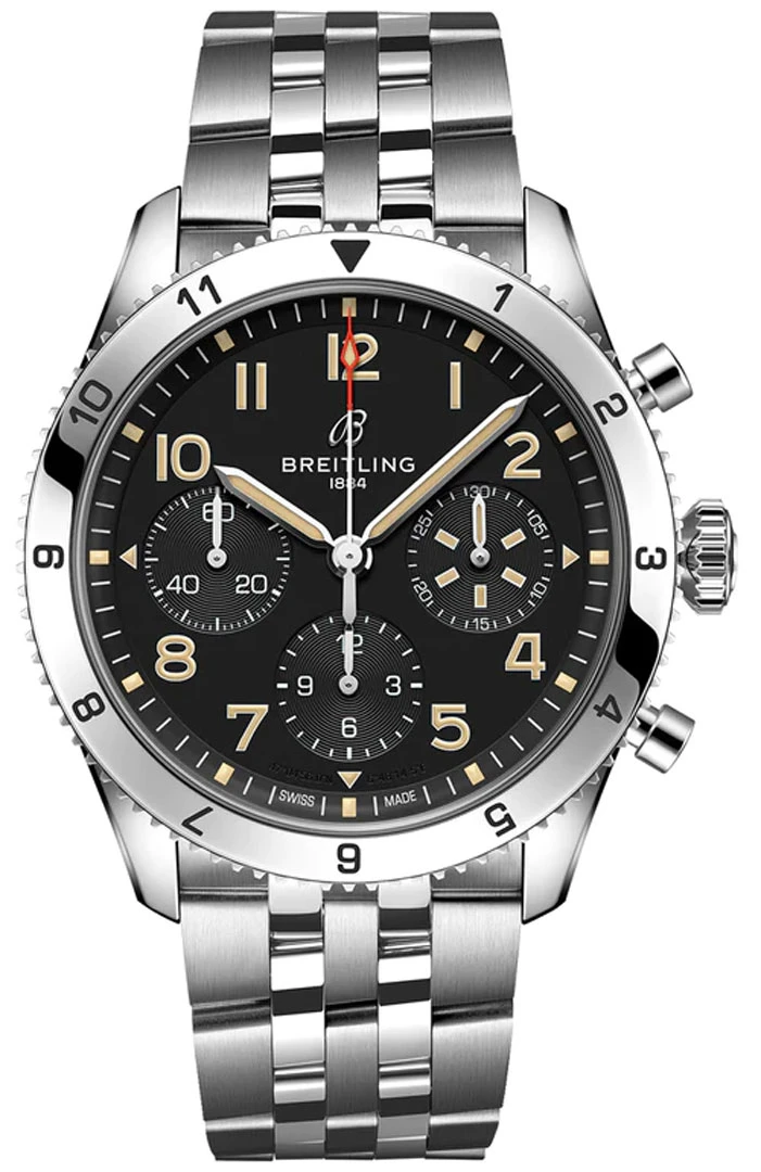 - Breitling in-house caliber B23, beats at 28,800 vph (4Hz), contains 27 jewels & has a power reserve of 48 hours.