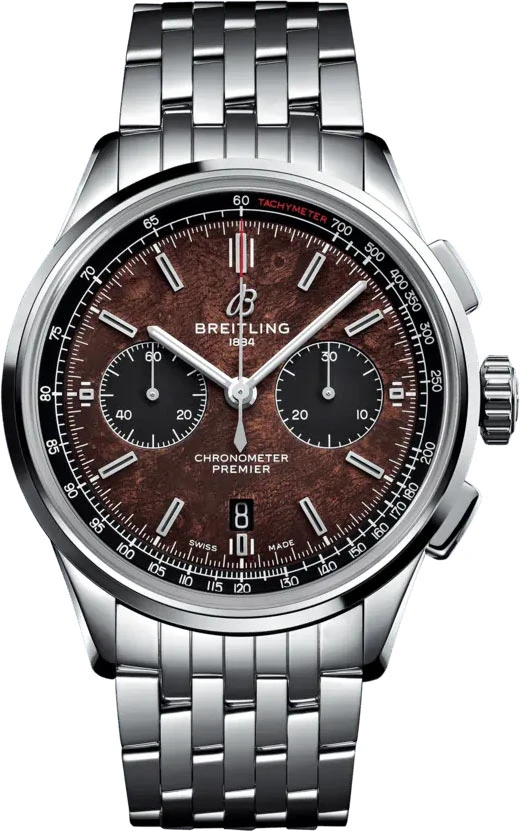 - Breitling in-house caliber B01, beats at 28,800 vph, contains 41 jewels & has an approximate power reserve of 70 hours.