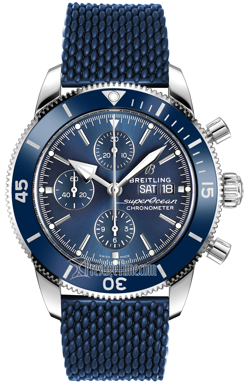 - Blue dial with silver rimmed blue subdials