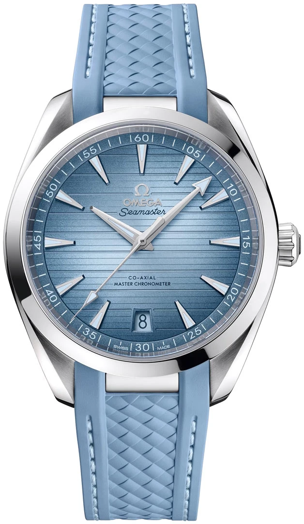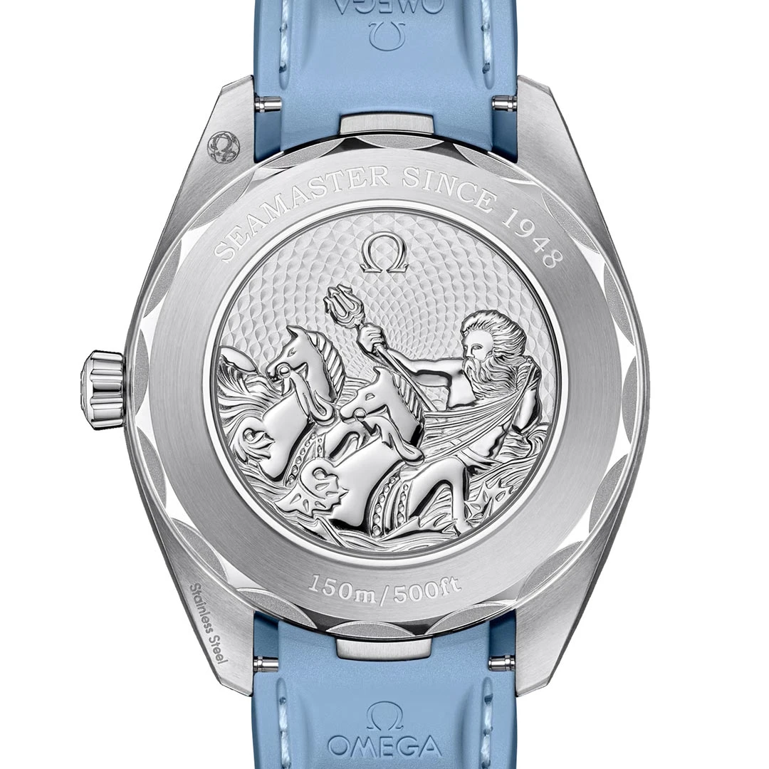 AQUA TERRA 150M SUMMER BLUE COLLECTION. The case back features the Seamaster logo depicting a trident-bearing Poseidon and two seahorses: OMEGA’s 1956 original and the brand’s current design.