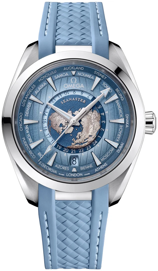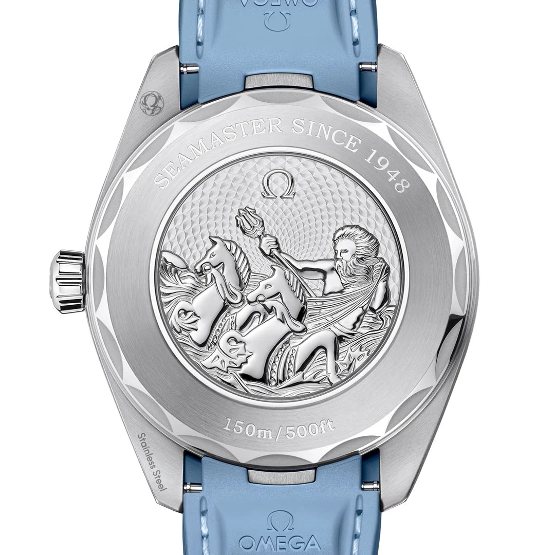 AQUA TERRA 150M GMT WORLDTIMER SUMMER BLUE COLLECTION. The case back features the Seamaster logo depicting a trident-bearing Poseidon and two seahorses: OMEGA’s 1956 original and the brand’s current design.