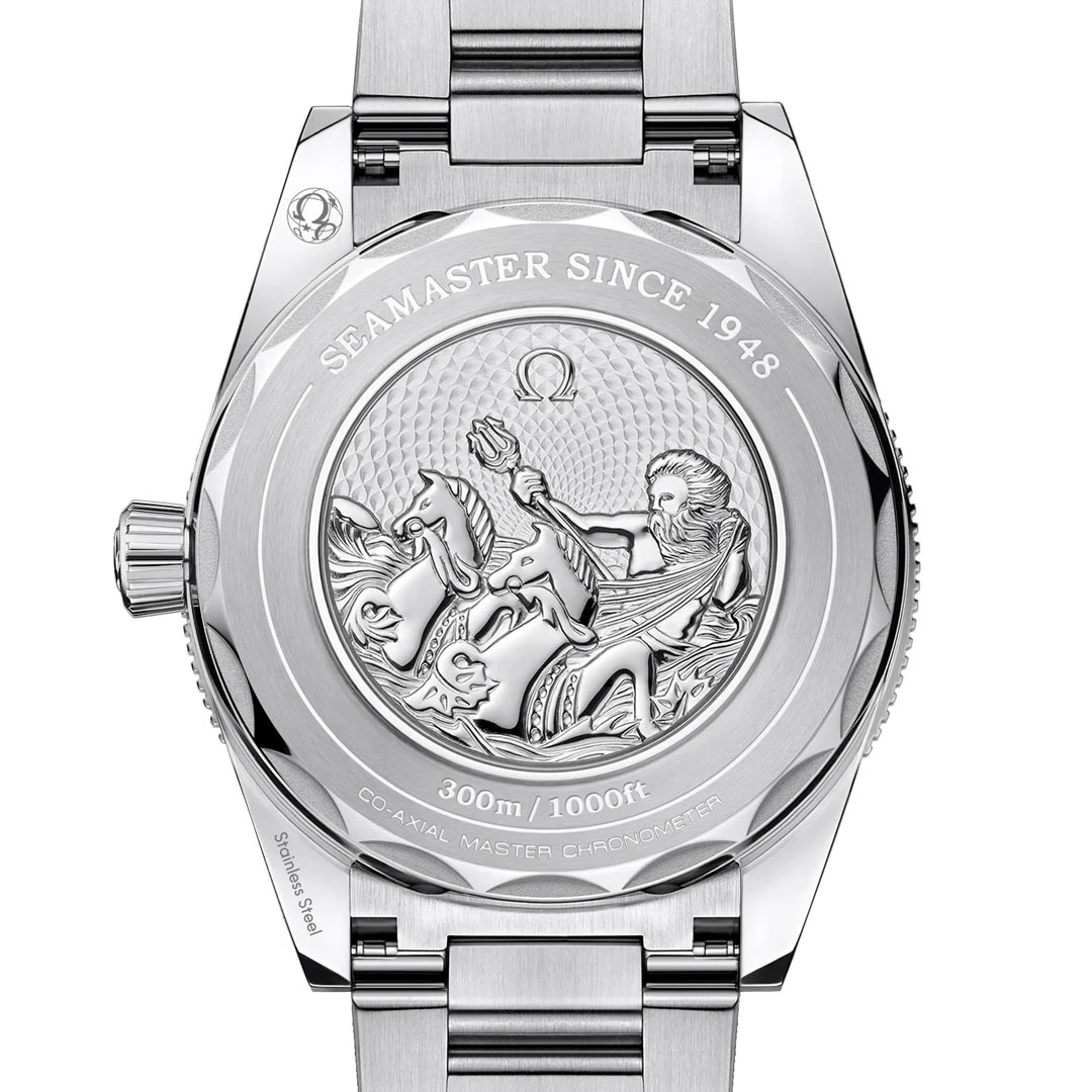 SEAMASTER 300 SUMMER BLUE COLLECTION. The case back features the Seamaster logo depicting a trident-bearing Poseidon and two seahorses: OMEGA’s 1956 original and the brand’s current design.