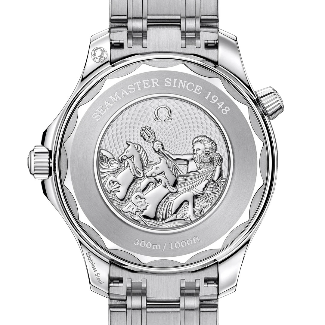 SEAMASTER DIVER 300M SUMMER BLUE COLLECTION. The case back features the Seamaster logo depicting a trident-bearing Poseidon and two seahorses: OMEGA’s 1956 original and the brand’s current design.