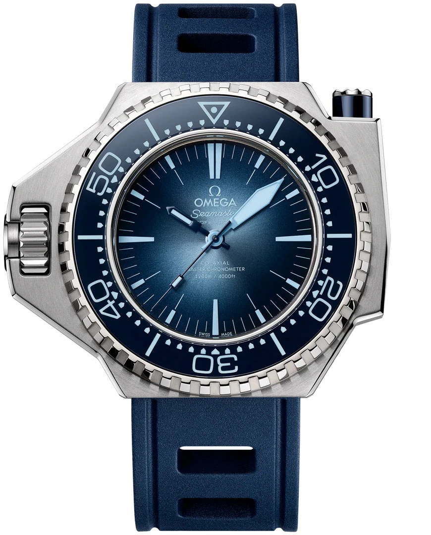 PLOPROF 1200M SUMMER BLUE COLLECTION. The case back features a laser-engraved Seamaster logo depicting a trident-bearing Poseidon and two seahorses: OMEGA’s 1956 original and the brand’s current design.