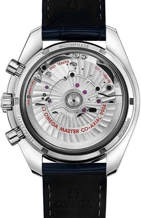 - Omega Master Co-Axial caliber 9904, beats at 28,000 vph (4Hz), contains 54 Jewels & has an approximate power reserve of 60 hours, courtesy of its twin barrels mounted in series.