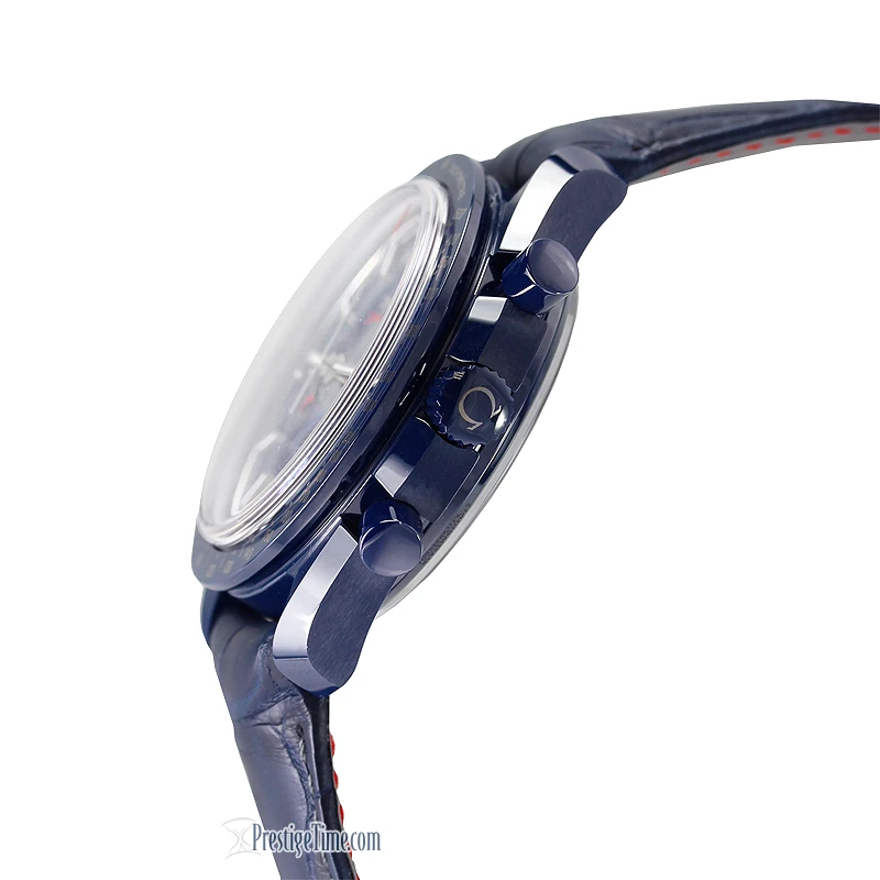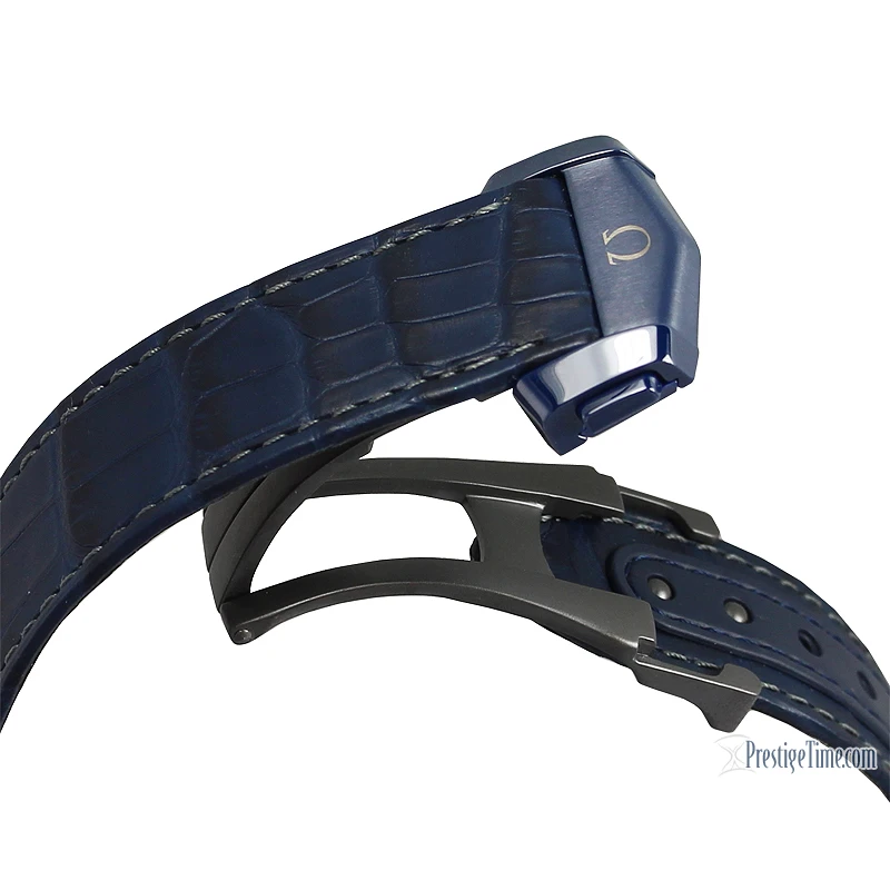 - Polished blue ceramic bezel with satin finished Liquidmetal Tachymeter scale.