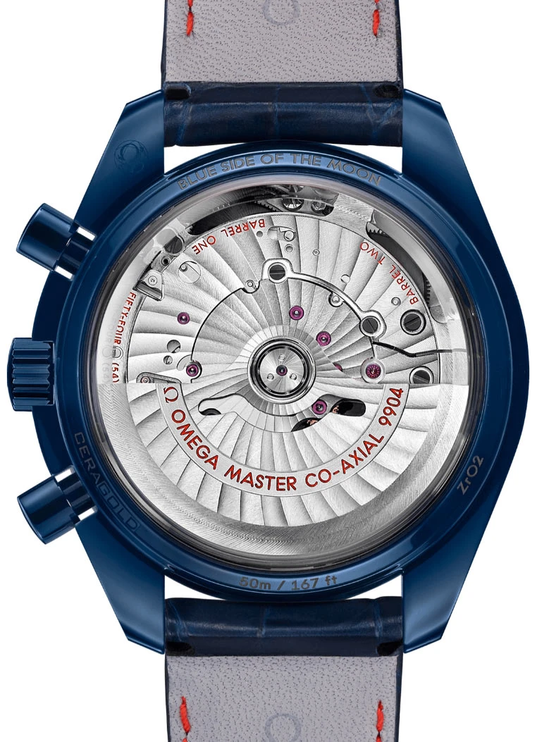 - Omega Master Co-Axial caliber 9904, beats at 28,000 vph (4Hz), contains 54 Jewels & has an approximate power reserve of 60 hours, courtesy of its twin barrels mounted in series.