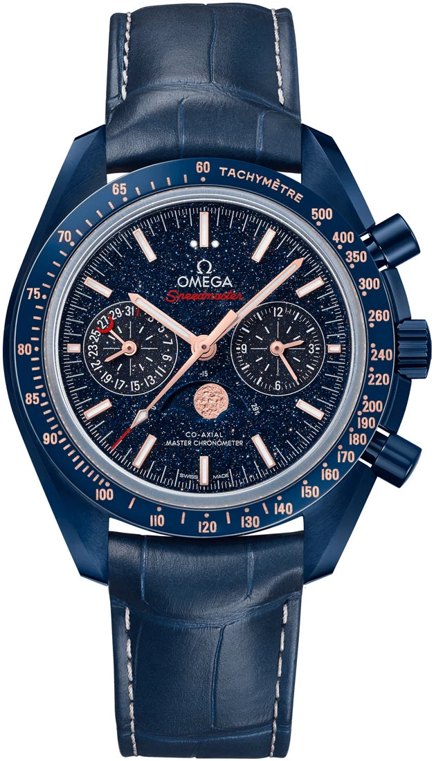 - Blue enamel aventurine glass moonphase disc with the moons in 18kt Sedna gold.