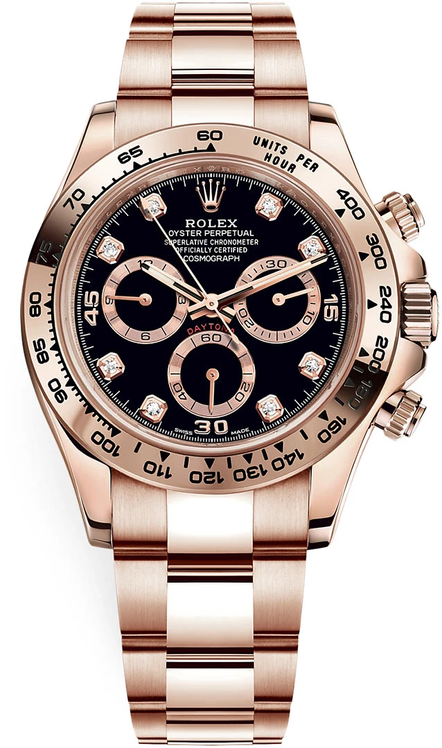- Polished 18kt Everose gold screw-down locking crown & chronograph buttons.