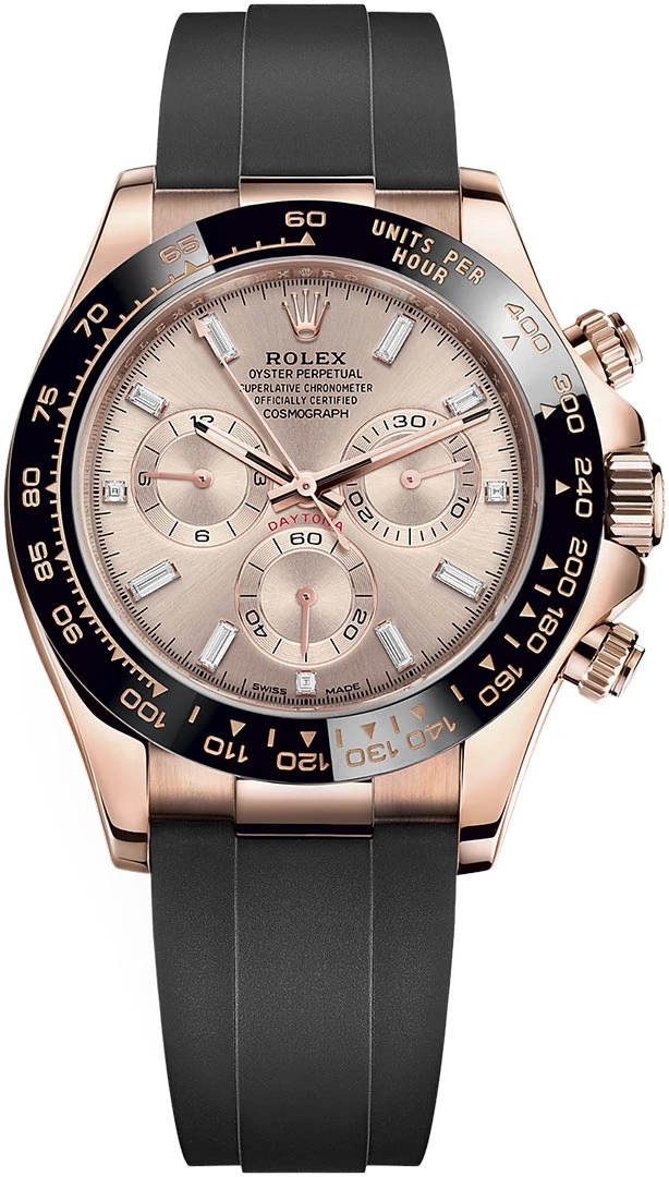 - Polished 18kt Everose gold screw-down crown with Rolex’s patented “Triplock” triple waterproofness system, ensuring that the crown screws down against the Oyster case as securely as a submarine hatch.