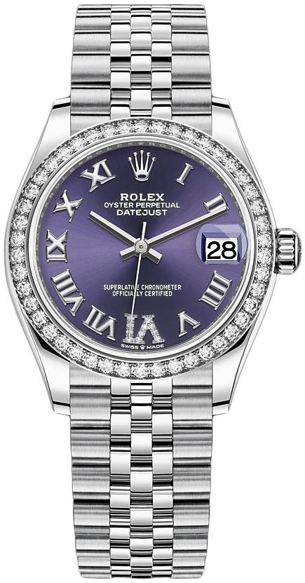- Applied polished Roman numeral hour markers & a pave diamond set VI hour marker.