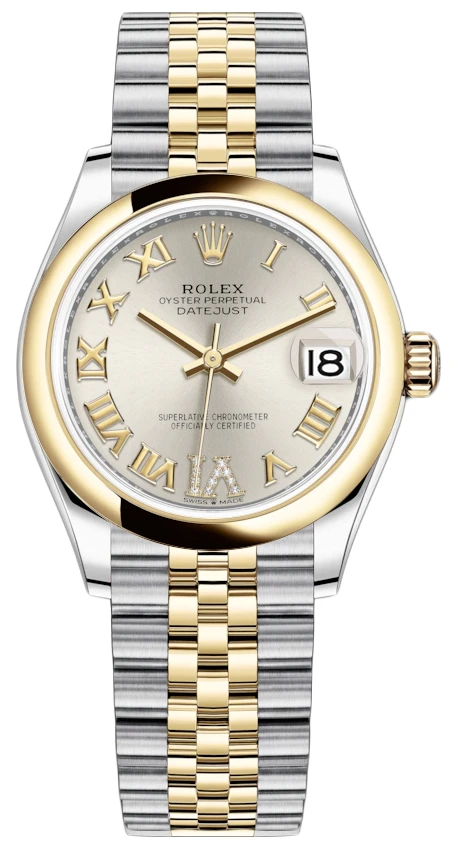 - Applied polished yellow gold Roman numeral hour markers & a pave diamond set VI hour marker.