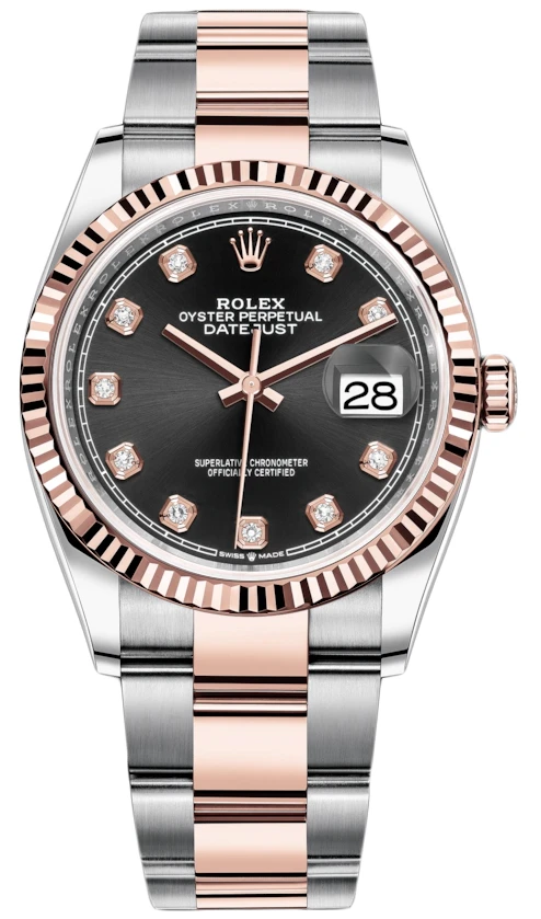 - 10 diamond hour markers with the Rolex Crown logo at the 12 o’clock position.
