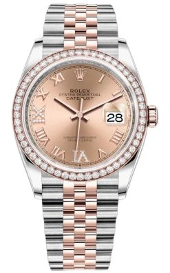- Applied polished everose gold Roman numeral hour markers & pave diamond set VI & IX hour markers.