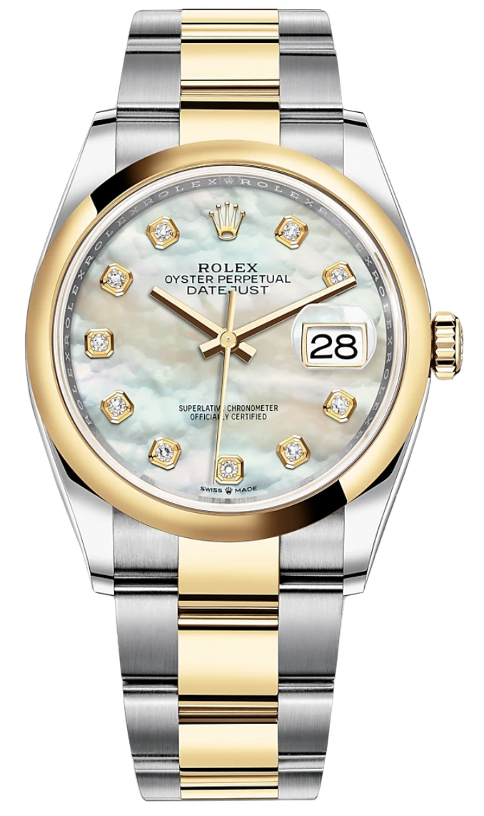 - 10 diamond hour markers with the Rolex Crown logo at the 12 o’clock position.