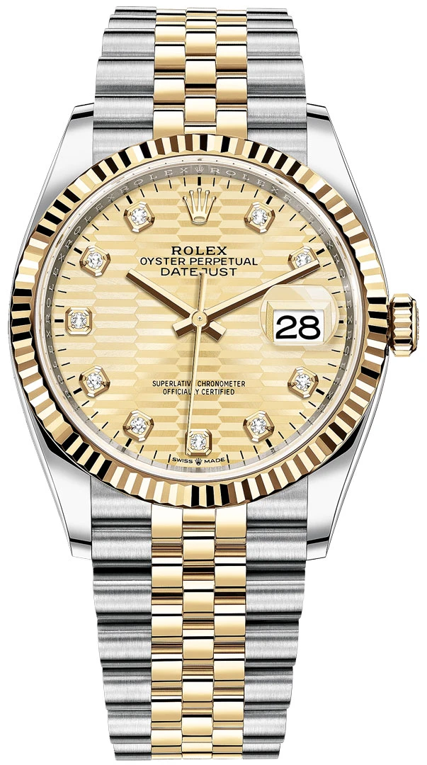 - Date window displayed at the 3 o’clock position with a cyclops magnifying lens.