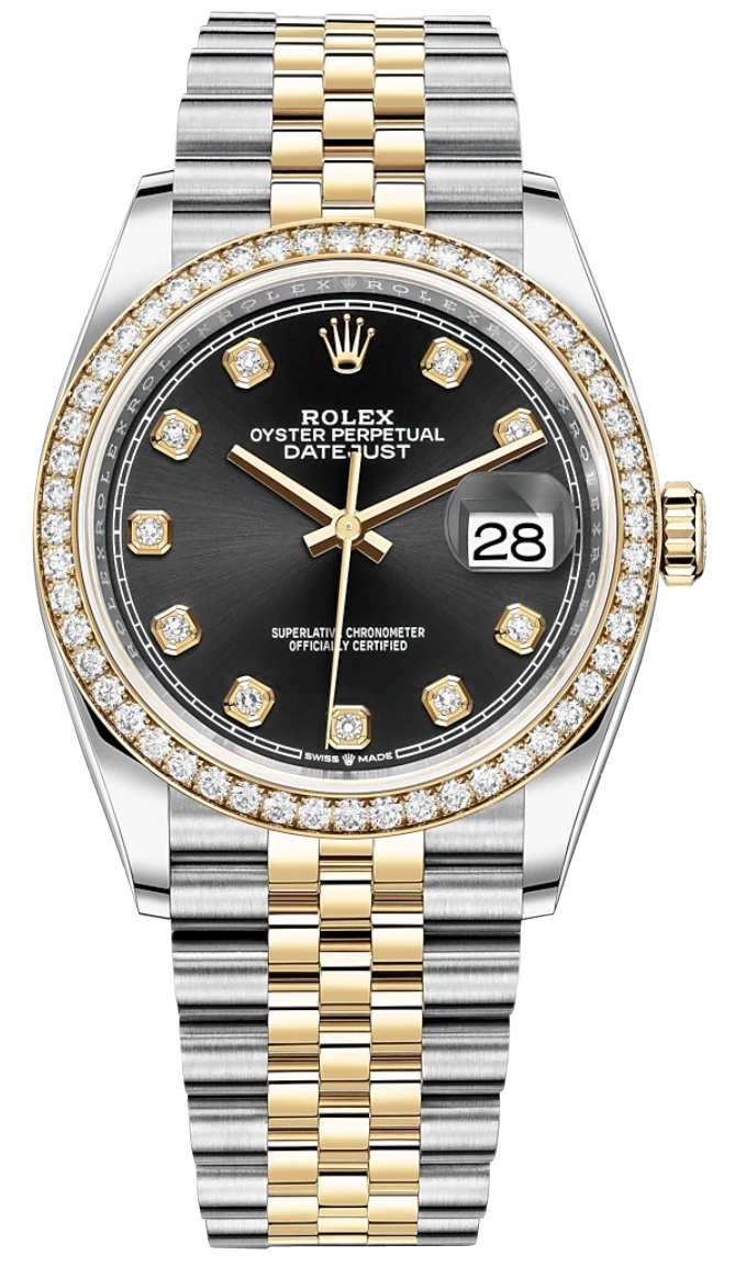 - 10 diamond hour markers with the Rolex Crown logo at the 12 o’clock position.