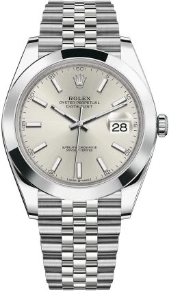 - Date window displayed at the 3 o’clock position with a “cyclops” magnifying lens.