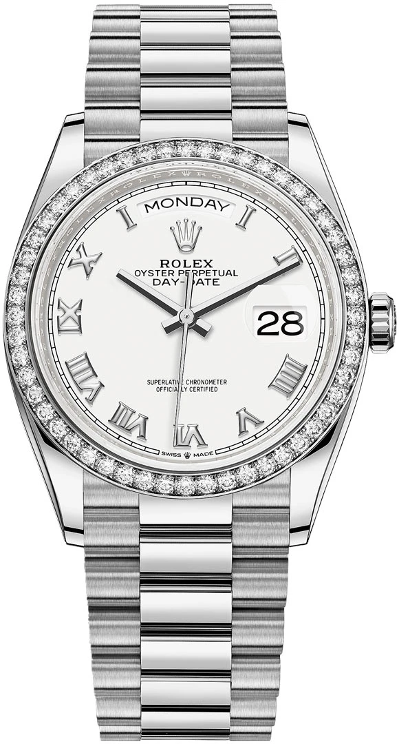 - Polished 18kt white gold bezel, factory set with 52 brilliant-cut diamonds.