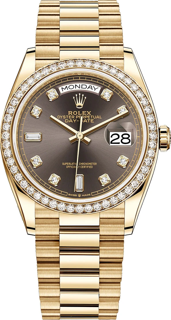 - Polished 18kt yellow gold bezel, factory set with 52 brilliant-cut diamonds.