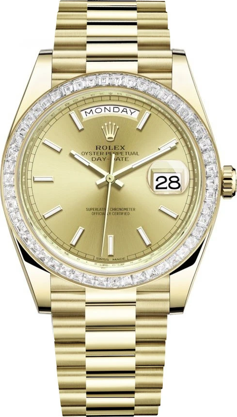 - Polished 18kt yellow gold bezel, factory set with 40 trapeze-cut baguette diamonds weighing a total of +/- 3.48 ct.