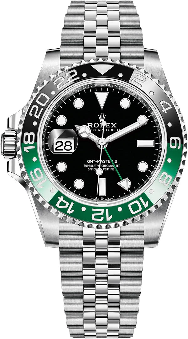 - GMT/Dual Time zone is indicated by the green hand with a luminous filled arrow-head tip pointing to the 24 hour indications on the bezel.