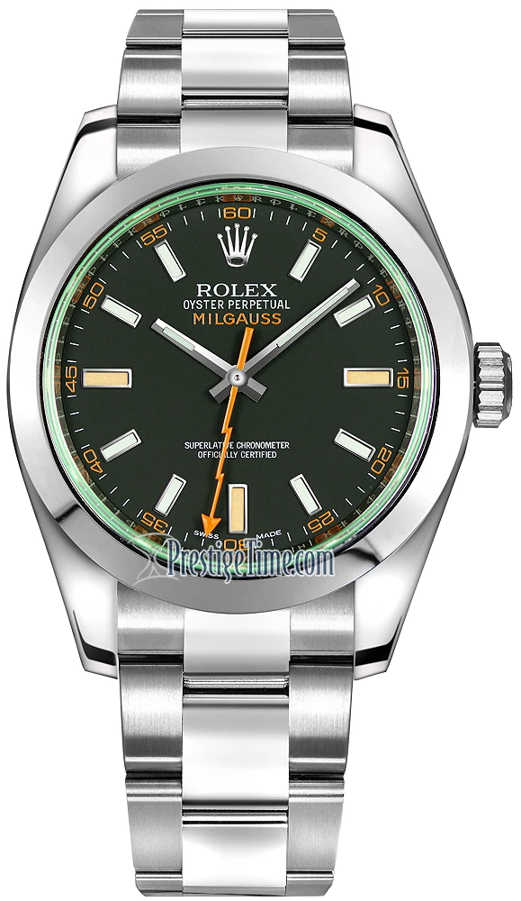 The Rolex Oyster Perpetual Milgauss is designed to withstand magnetic fields of up to 1000 gauss – hence the name MILgauss, MILLE being the French word for 1000. The watch features a metal shield inside the case which surrounds & protect the movement. The shield is made of ferromagnetic alloys selected by Rolex to protect the movement from magnetic fields.